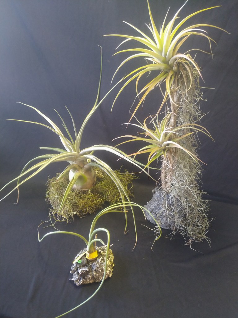 We try to mist these three times per week. Don’t plant them, they’re called air plants for a reason.